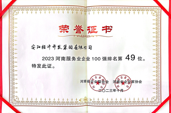 近日,集團(tuán)在河南企業(yè)100強(qiáng)高峰會上入選“2023河南服務(wù)業(yè)企業(yè)100強(qiáng)”,位列榜單第49位,這是集團(tuán)連續(xù)第2年獲此榮譽(yù)。